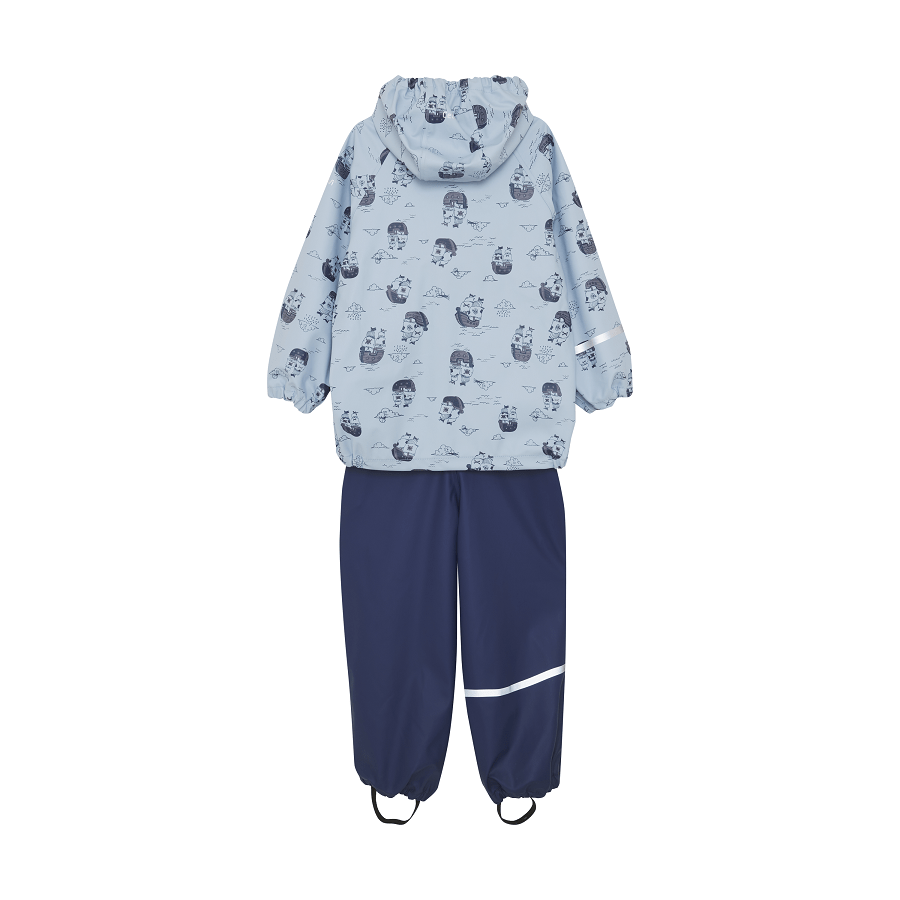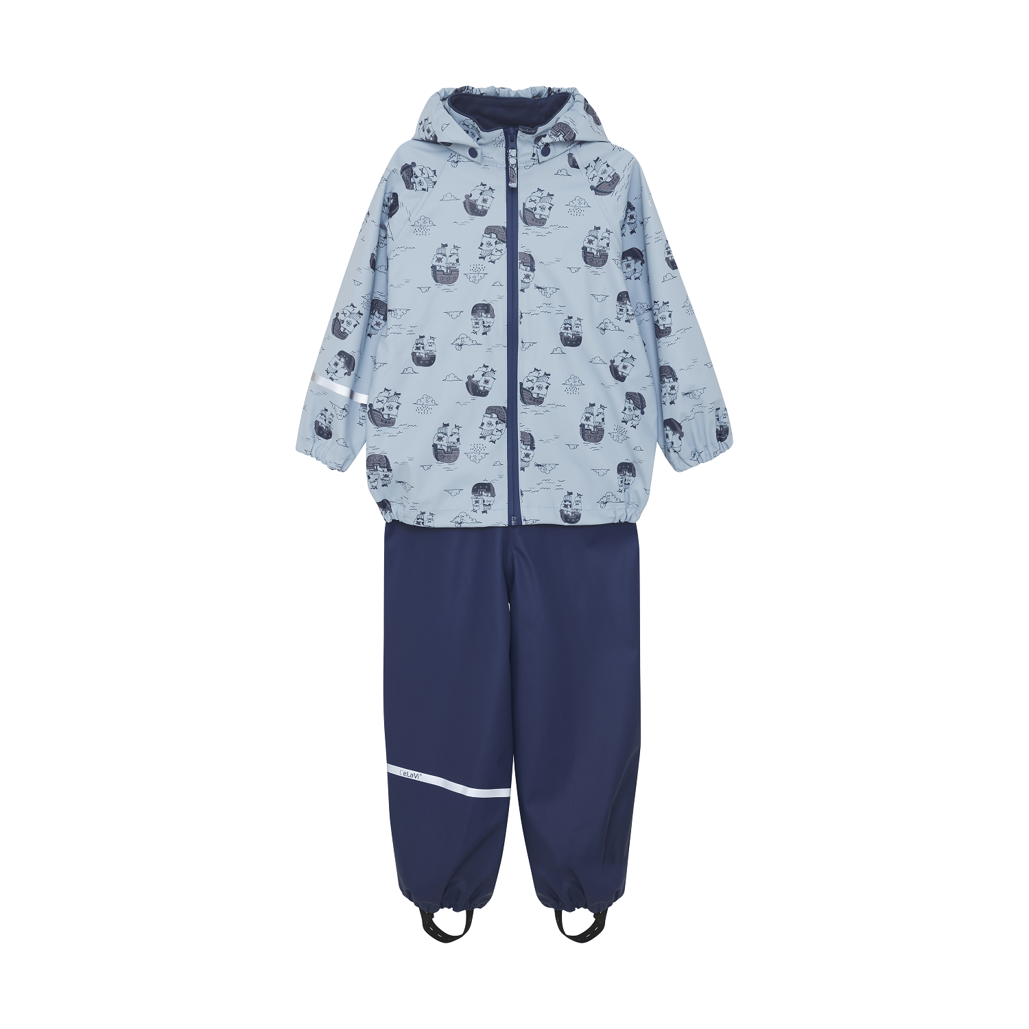 Pükstel on reguleeritavad traksid ja trukid kuni suuruseni 110, pärast mida on lastne vöökoht ilma traksiteta. Pükstel on praktilised ja reguleeritavad elastsed rihmad, mida saab jalanõude alla tõmmata. Jakk sulgub veekindla lukuga. Ühel käel ja ühel jalal on kitsad helkurribad. Ühe käe ülaosas ja kapuutsi tagaküljel on helkurribaga trükitud logo. CeLaVi vihmajakil on eemaldatav kapuuts, mis kinnitatakse trukkidega. Kapuutsi avausel, varrukatel ja vöökohal on elastsed ribad parema istuvuse tagamiseks. Komplekti veesamba rõhk on 10 000 mm. Sertifitseeritud vastavalt GRS-ile – valmistatud 66% taaskasutatud materjalist CERES-0366., Pesta 40 °C juures, Mitte pleegitada, Kuivatada nööril, Mitte kuivatada trummelkuivatis, Mitte triikida, Mitte keemiliselt puhastada, , , , Veekindel kangas 10 000 mm, , , ,